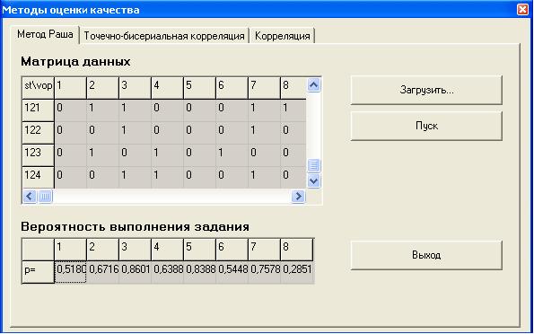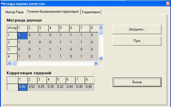 В программе, соответсвенно, этот метод реализован аналогично методу Раша, т.е. на форме представлены загружаемая матрица результатов тестирования и таблица с рассчитанными коэффициентами точечно-бисериальной корреляции: