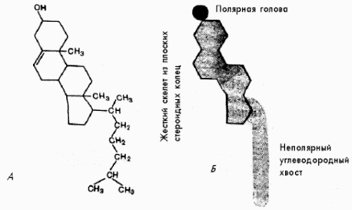 Рис.1 Молекула холестерина (холестерола) в виде химической формулы (А) и схематического изображения (Б)