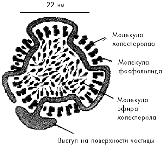 В клетках кишечника молекулы холестерина объединяются в группы примерно по 1500 штук и окружаются мембраной, молекулы наружного слоя которой водой смачиваются. Получаются этакие мембранные микрокапсулы диаметром всего около 22 нм, которые могут путешествовать по кровеносным сосудам, перенося внутри себя холестерин. Такие шарики называются липопротеидами низкой плотности (ЛПНП). Судя по названию, можно предположить, что в кровяном русле есть еще и липопротеиды высокой плотности (ЛПВП). Это действительно так, но о них речь пойдет чуть позже.