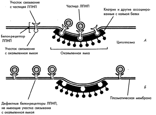 Рис.3 Схема связывания ЛПНП с белком-рецептором в нормальной (А)