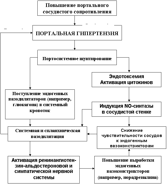 В патогенезе ПГ при ЦП большое значение имеет развитие узловой регенерации, нарушающей дренажную функцию ветвей печеночных вен, что способствует развитию постсинусоидальной блокады портального кровотока. В результате замещения паренхимы печени соединительной тканью происходит редукция внутрипеченочных разветвлений воротной вены. Определенную роль в развитии гипертензии играют воротно-печеночные анастомозы и новообразованные шунты между ветвями печеночной артерии и воротной вены, которые при увеличении притока артериальной крови ведут к повышению гидростатического давления в портальном русле. За счет повышения давления в системе воротной вены начинают функционировать естественные портокавальные анастомозы. При циррозе артериальный кровоток печени резко снижен вследствие сужения всего артериального русла печени, тогда как кровоток в сторону селезенки возрастает. При увеличении объемного кровотока по селезеночной артерии и затрудненном оттоке по селезеночной вене происходит увеличение размеров селезенки с возрастанием количества крови в органе с 50 мл до 1000 мл.
