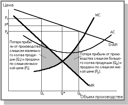 Как мы можем проверить, что Q* - объем производства, максимизирующий прибыль? Предположим, монополист производит меньшее количество продукции - Q1 и соответственно получает более высокую цену Р1. Как показывает рис.1, в таком случае предельный доход монополиста превышает предельные издержки, и если бы он производил большее количество продукции, чем Q1, он получил бы добавочную прибыль (МR - МС), т.е. увеличил бы свою совокупную прибыль. Фактически монополист может увеличивать объем производства, повышая свою совокупную прибыль вплоть до объема производства Q*, при котором дополнительная прибыль, получаемая от выпуска еще одной единицы продукции, равна нулю. Поэтому меньшее количество продукции Q1 не максимизирует прибыль, хотя и позволяет монополисту установить более высокую цену. При объеме производства Q1 вместо Q* совокупная прибыль монополиста будет меньше на величину, равную заштрихованной площади между кривой МR и кривой МС, между Q1 и Q*.