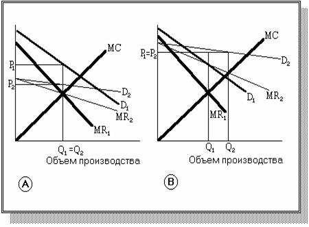 В условиях монополизированного рынка кривая предложения отсутствует. Другими словами, нет пропорциональной зависимости между ценой и производимым количеством. Причина заключается в том, что решение монополиста по объему производства зависит не только от предельных издержек, но и от формы кривой спроса. Изменения в спросе не приводят к пропорциональным изменениям цены и предложения, как это происходит с кривой предложения для рынка свободной конкуренции. Вместо этого изменения в спросе могут привести к изменению цен при постоянном объеме производства, изменения в объеме производства могут произойти без изменения цены или же измениться могут как цена, так и объем производства. Это показано на рис.2а и 2b. На обоих частях рисунка кривой первоначального спроса D1 соответствуют кривая предельного дохода МR1, первоначальная монопольная цена Р1 и объем производства Q1. На рис.2а кривая спроса смещается вниз и поворачивается. Новые кривые спроса и предельного дохода обозначены D2 и МR2. Отметим, что MR2 пересекает кривую издержек в той же точке, что и MR1. В итоге объем производства продукции остается прежним. Цена, однако, снизится до Р2.