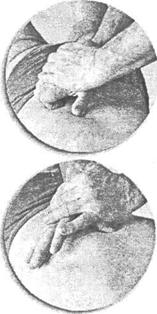 Мышцы спины. Массажист накладывает «ближнюю» руку на поясничную область так, чтобы большой палец лежал на длиннейшей мышце вдоль позвоночного столба, а четыре были бы слегка отведены в сторону. Разминание выполняют по нескольким линиям, пока рука не коснется кушетки. Число вращений зависит от длины спины (примерно 9–12).