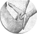 Передняя поверхность голени. Массируемый лежит на спине, нога согнута в коленном суставе. Массажист сидит на уровне стопы пациента, «дальней» рукой поддерживает колено, а «ближней» разминает передние боль-шеберцовые мышцы.
