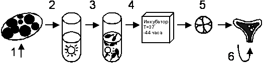 Рис.1. Схема лечения бесплодия методом экстракорпорального оплодотворения: 1 - яичник со множеством фолликулов - результат воздействия препаратов; 2 - пункция яичников, получение яйцеклеток (в строго определенный момент); 3 - соединение яйцеклеток со специально подготовленными сперматозоидами; 4 - культивирование в специальных условиях в течение 24 - 62 ч; 5 - образовавшийся 4-клеточный эмбрион; 6 - перенос эмбрионов в полость матки.