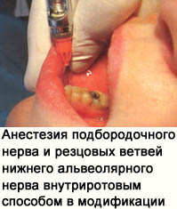 Анестезия подбородочного нерва Как самостоятельная методика почти не используется, является дополнительной при хирургических вмешательствах на фронтальном отделе альвеолярного отростка нижней челюсти. Являясь частью нижнелуночкового нерва, подбородочный нерв выходит из кости в середине отрезка между нижним краем челюсти и альвеолярным отростком на уровне второго премоляра. Вкол делают в переходную складку между вторым премоляром и первым моляром, продвигая иглу на глубину 1-2 см
