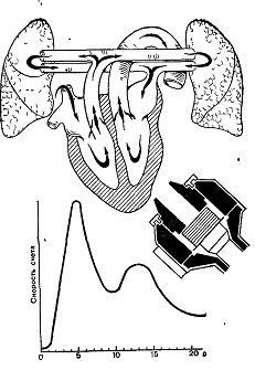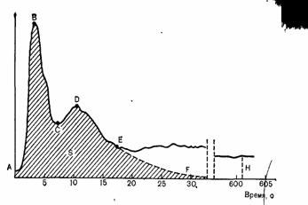 РКГ имеет форму кривой с двумя волнами (пиками, вершинами) и отражает прохождение радиоактивного индикатора через камеры сердца (см. рис. 2). После внутривенного введения за 2—3 сердечных сокращения количество индикатора в правых отделах сердца достигает максимума, что представляется на РКГ восходящим отрезком АВ и вершиной первой волны В. Последующий спад концентрации {ВС) отражает преобладание выброса индикатора из правого желудочка в малый круг кровообращения. Поступление индикатора из малого круга кровообращения в левые отделы сердца формирует восходящий отрезок (CD) и вершину (D) второй волны. Вторичный спад активности (DE), отражающий выход индикатора из левого желудочка в большой круг кровообращения, не достигает изолинии, так как начинается третья волна — волна рециркуляции. Она обусловлена в основном прохождением индикатора через сосуды грудной клетки, а также возвращением его в сердце по наиболее коротким путям большого круга кровообращения.