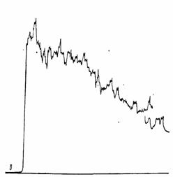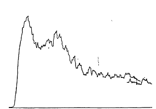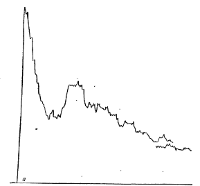 При недостаточности левого предсердно-желудочного клапана гемодинамические нарушения компенсируются за счет левого желудочка, который находится в условиях более доброкачественной изотонической гиперфункции. Кроме того, резервы миокарда левого желудочка значительно превосходят резервы левого предсердия. Поэтому истощение компенсаторных механизмов и развитие сердечной недостаточности у больных с недостаточностью левого предсердно-желудочкового клапана развиваются позже, чем у больных стенозом. Однако в связи с обратным током крови при дефекте левого предсердно-желудочкового клапана левое предсердие также перегружено, что затрудняет отток крови из легочных вен. Поэтому в поздних стадиях недостаточности левого предсердно-желудочкового клапана развивается гипертония в малом круге кровообращения, ведущая к гипертрофии правого желудочка. Морфологическая структура РКГ при этом пороке в ІиІІ стадиях мало отличается от кривых, полученных у здоровых лиц. Более характерную структуру кривые имеют при III и особенно IV стадии левого предсердно-желудочкового клапана. Определенная рельефность РКГ объясняется основным проявлением порока — обратным выбросом крови (регургитацией) из левого желудочка в левое предсердие во время систолы. В результате этого введенный индикатор задерживается в левых отделах сердца и выход его замедляется. Чем значительнее регургитация, тем дольше введенный РФП находится в левых отделах сердца и, следовательно, тем шире левая волна и меньше крутизна нисходящего отрезка (рис. 5а,5 6).