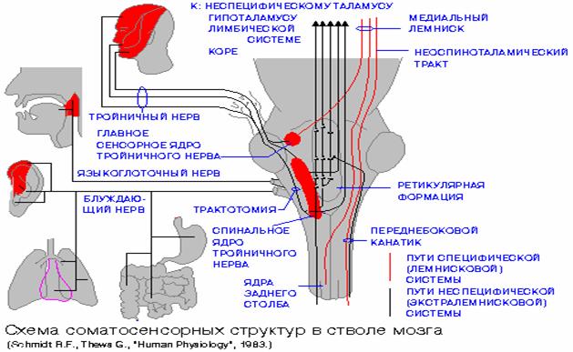 Любопытно отметить, что гистологические и электрофизиологические данные указывают на характерную деталь хода аксонов многих ретикулярных нейронов. Аксоны нейронов гигантоклеточного ядра, т. е. основного ядра ретикулярной формации, очень часто делятся Т-образно, и один из отростков идет вниз, образуя ретикулоспинальный путь, а второй вверх, направляясь в верхние отделы головного мозга. Создается такое впечатление, что и восходящие, и нисходящие функции ретикулярной формации могут быть связаны с деятельностью одних и тех же нейронов. По функциональным свойствам ретикулярные структуры, создающие восходящие влияния, также имеют много общего со структурами, обеспечивающими нисходящие влияния. Восходящие влияния несомненно носят тонический характер, они легко изменяются гуморальными факторами и высокочувствительны к фармакологическим веществам. Снотворное и наркотическое действие барбитуратов основано, по-видимому, именно на блокировании в первую очередь восходящих влияний ретикулярной формации.