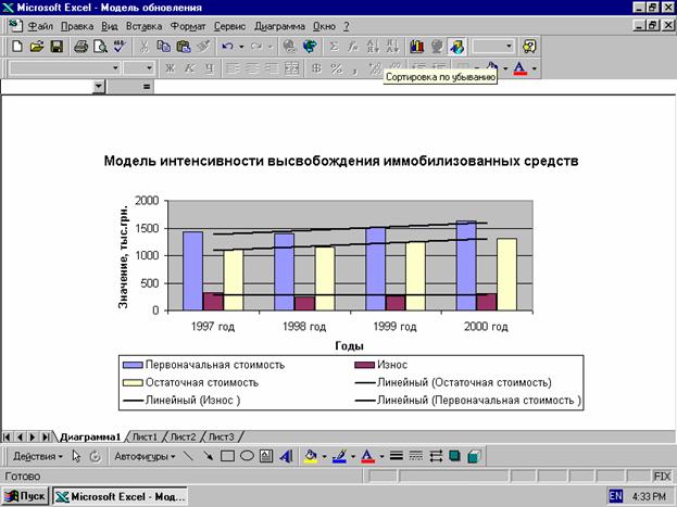 При составлении этой модели основные средства учитываются по статьям с определением фондорентабельности. На рисунке 3.3.3 приведена модель целесообразности замены основных средств.