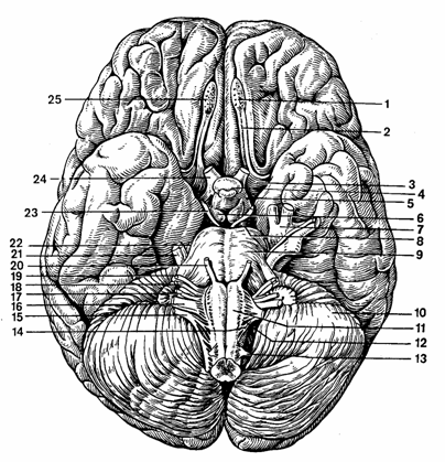 Рисунок A Основание головного мозга и выход корешков черепных нервов. |