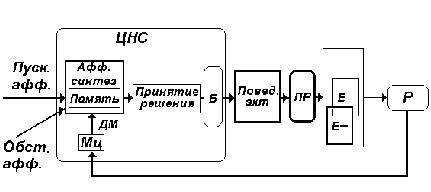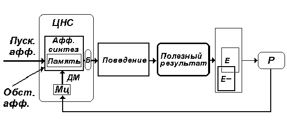 Рис. 9. Схема, иллюстрирующая развертывание в функциональной системе вслед за принятием решения двух узловых механизмов - механизмов эфферентного синтеза и акцептора результатов действия.