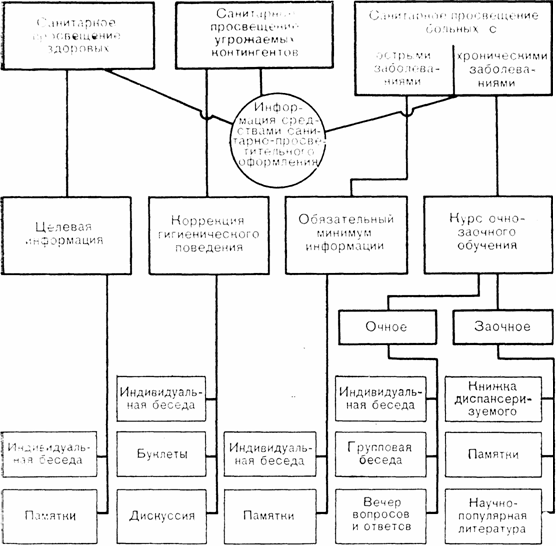 — отсутствие знаний об организации и методических подходах к этой работе, что приводит к нарушению основного принципа санитарного просвещения (дифференцированности и целенаправленности пропаганды), а среди форм санитарного просвещения преобладают чтение лекций и выпуск санитарно-просветительных бюллетеней. Кроме того, недостаточно внимания уделяется групповым и индивидуальным формам работы.