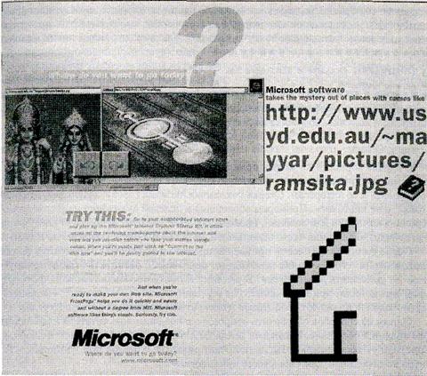 Эта реклама Microsoft Internet Explorer для начинающих демонстрирует, как нужно соединять слова с изображением. Надпись на рис. «Программное обеспечение Microsoft снимает таинственную завесу с мест, носящих такие имена, как http:// www.us yd.edu.au/-ma ууаг/pictures/ramsita.jpg. Попробуйте это: зайдите в ближайший магазин, продающий программное обеспечение, и купите Microsoft Internet Explorer для начинающих. Он избавит вас от неудач в работе с Internet и даже позволит вам попрактиковаться перед тем, как вы предпримете сумасшедшее путешествие в режиме on-line. Когда вы будете готовы, нажмите на кнопку «Connect to the Web now», и сразу попадете в Internet. Если вы захотите открыть собственную страницу в Internet, Microsoft Front Page поможет вам сделать это быстро и легко. Программные продукты Microsoft любят простые вещи. Серьезно. Попробуйте.Microsoft — Куда вы хотите отправиться сегодня?