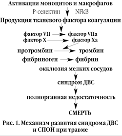адгезивности тромбоцитов, и в связи с этим активация первой фазы свертывания, и повышение концентрации фибриногена. Эти показатели можно определить с помощью коагулограммы, которая позволяет определить состояние свертывающей и противосвертывающей системы в периферических сосудах происходит образование сгустков крови: слипаются тромбоциты, начинается образование фибриновых глобул, образуются тромбы в мелких сосудах. Это тромбирование мелких сосудов как правило к некрозу не приводит, однако вызывает значительную ишемизацию тканей различных органов, тромбирование происходит во всем организме, поэтому синдром называется диссеминированным (рассеянным). Период гиперкоагуляции характеризуется активацией плазменных систем свертывания крови, внутрисосудистой агрегацией тромбоцитов и других форменных элементов крови, нарушением микроциркуляции в разных органах в результате блокады сосудистого русла массами фибрина и агрегатами клеток. Фаза гиперкоагуляции также может развиваться постепенно при медленном поступлении малых доз протромбиназы. Однако медленное течение может закончиться взрывом с быстрым развитием ДВС-синдрома. Кроме диссеминированного внутрисосудистого свертывания, в ряде случаев отмечаются только локальное ограниченное внутрисосудистое свертывание и тромбообразование. Такой процесс наблюдается в гигантской гемангиоме Казабаха — Мерритта. Стадия гиперкоагуляции нередко длится кратковременно - несколько минут, и чтобы ее не пропустить необходимо всем пациентам, находящимся в стадии тяжелого шока, которым применяются массивная инфузионная терапия, у которых имеются признаки сепсиса надо как можно раньше произвести коагулограмму, иначе процесс перейдет в следующую фазу