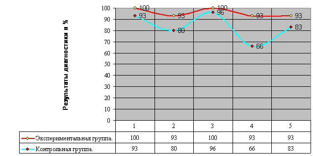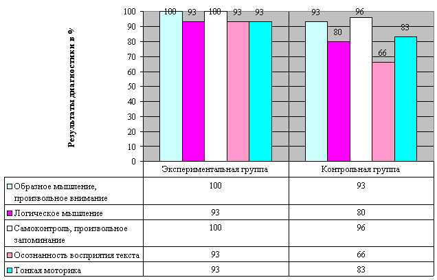 Из сравнительного графика № 8, диаграммы№ 9 видно, что значительно улучшилось развитие логического и образного мышления, способность к анализу и синтезу (1,2). В экспериментальной группе показатели выше. Произвольное запоминание по результатам диагностики в логопедических группах одинаковое. Показатели диагностики речевого развития, осознанности восприятия и использования им речи, развитие тонкой моторики в экспериментальной группе значительно превышают показатели в контрольной группе.
