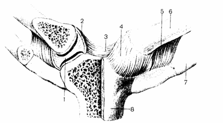 1 - discus articularis; 2 -capsula articularis; 3 - lig. interclaviculare; 4 - lig, sternoclaviculare anterius; 5 - lig. сostoclaviculare; 6 - clavicula; 7 - costa I; 8 - manubrium sterni.