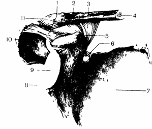 1 – lig. coracoacromiale; 2 – lig. trapezoideum; 3 – lig. conoideum; 4 - extremitas acromialis claviculae; 5 - processus coracoideus; 6 – lig. transversum scapulae superius; 7 – scapula; 8 - labrum glenoidale; 9 - cavitas glenoidalis; 10 – acromion; 11 – art. acromioclavicularis.