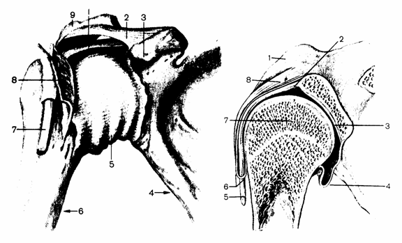 1 - lig. coracohumerale; 2 - lig. coracoacromiale; 3 - processus coracoideus; 4 - scapula; 5 - capsula articularis; 6 – humerus; 7 - tendo m. bicipitis brachii (caput longum); 8 - tendo m. subscapularis; 9 - acromion.