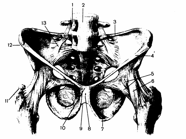 Суставы пояса нижней конечности, articulationescingulimembriinferiores, образуются за счет соединения тазовых костей друг с другом и с крестцом (рис. 7). Задний конец каждой тазовой кости сочленяется с крестцом при помощи парного крестцово-подвздошного сустава, а спереди тазовые кости образуют лобковый симфиз.