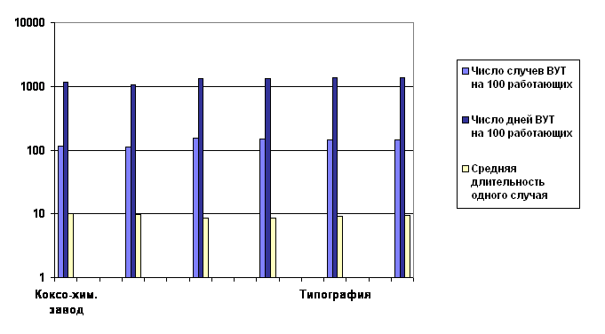 Средняя длительность одного случая заболевания на коксохимическом заводе в среднем превышает аналогичный показатель в среднем по отрасли, что связано, вероятно, с более тяжелыми условиями труда, низкой механизацией технологических процессов, нерациональным планированием рабочего дня, отсутствием благоприятных микроклиматических условий, худшей организацией профилактических работ и оказания медицинской помощи, а также с факторами, которые перечислены выше.