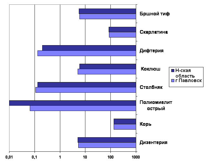 При анализе таблицы выявлено, что показатели заболеваемости по брюшному тифу, паратифам А, В, С, скарлатине, острому полиомиелиту, кори и дизентерии в г. Павловске выше, чем в Н-ской области, что может быть связано несовершенством комплекса профилактических мероприятий: несвоевременной вакцинацией или ее отсутствием, вакцинацией на фоне уже имеющегося заболевания, с отсутствием информированности населения о важности соблюдение личной гигиены, недостаточным санитарным и противоэпидемическим контролем на предприятиях общественного питания, несоблюдением сроков реализации продуктов, а также с недостаточностью диагностических методов исследования, поздним выявлением данных патологий, нехваткой инфекционных, педиатрических коек в стационаре, так как в г. Павловске отсутствует необходимая обеспеченность население койками в ЛПУ. К этому может привести отсутствие достаточной квалификации врачей в г. Павловске, нехваткой медикаментозных средств, несоблюдения сроков карантина и неправильное ведение реабилитационного периода.