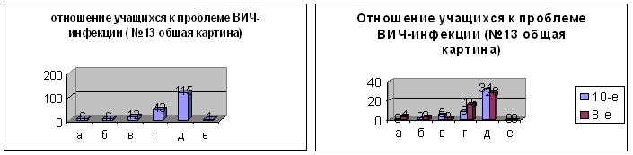 Отношение к данной проблеме мы изучили с помощью специфического вопроса-ситуации(13). Глядя на диаграмму(см. диаграмму10) видно, что большинство подростков сами готовы бороться со СПИДом как с проблемой социальной, но, скорее всего, не знают как, о чём свидетельствует сравнительно низкий показатель информированности, а также то, что треть ответила «На тебя это не повлияет». Мы это вывели из того, что достаточно малое количество тестируемых готово пренебречь дружбой, и достаточно много людей готово помочь другу, узнав, что он заражён ВИЧ. также можно заметить, что они далеки от сознания того, что такого человека можно уважать.