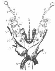 Рис.1. Эмбриональная закладка вилочковой железы у человека. I-V – жаберные карманы; 1 – зачаток щитовидной железы; 5 – зачатки вилочковой железы; 6 – ультимобронхиальные тельца; 7 – слуховая (евстахиева) труба и полость среднего уха; 8 – зачаток миндалины (точками обозначены скопившиеся вокруг него лимфоциты); 9 – околощитовидные железы; 10 – тимо-глоточный проток; 11- дуга аорты; 12 – правая общая сонная артерия; 13 – правая подключичная артерия; 14 – левая подключичная артерия; 15 – доли вилочковой железы. |