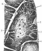 Рис.2. Строение дольки вилочковой железы. 1 – корковое вещество; 2 – мелкая жировая долька в капсуле железы; 3 – мозговое вещество; 4 – междльковая соединительнотканная прослойка; 5 – тельце вилочковой железы (тельце Гассаля); 6 – кровеносный сосуд в междольковой прослойке. |