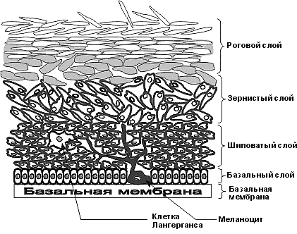 Эпидермис — это верхний, постоянно обновляющийся слой кожи, состоит из 5 слоев клеток, отличающихся, количеством и формой, а так же функциональной характеристикой. С дермой его связывает особая структура — базальная мембрана, на которой располагается однорядный базальный (зародышевый) слой призматических цилиндрических клеток которые непрестанно делятся, обеспечивая обновление кожи. Базальная мембрана образуется за счет корнеподобных отростков нижней поверхности этих клеток. Это очень важное образование. Она служит фильтром, который не пропускает крупные заряженные молекулы, а также выполняет роль связующей среды между дермой и эпидермисом. Зона базальной мембраны при световой микроскопии и окраске гематоксилин-эозином в норме не видна; при окраске по Шиффу она выявляется в виде гомогенной ленты толщиной 0,5-1,0 мкм. Ультраструктурные и иммунологические исследования позволили установить, что ЗБМ представляет собой сложную структуру, предназначенную для соединения базального слоя с дермой. Верхняя часть ЗБМ состоит из цитоплазматических тонофиламентов базальных клеток, которые соединяются с полудесмосомами. Полудесмосомы связаны с lamina lucida и lamina densa якорными филаментами. Нижняя часть ЗБМ соединена с дермой якорными филаментами, проходящими через ее коллагеновые волокна. Значение этих структур в поддержании целостности кожи продемонстрировано при буллезном эпидермолизе — наследственном заболевании, при котором они не образуются или исчезают.