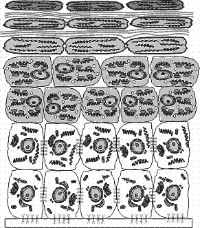 Три слоя, расположенные выше базального, отличаются гистологически и представляют собой различную степень дифференцировки кератиноцитов в роговые клетки при движении кнаружи. Непосредственно над базальным слоем находится шиповатый слой (stratum spinosum). Это название связано с тем, что большое количество десмосом и кератиновых филаментов создает впечатление шипов. Над шиповатым слоем располагается зернистый. В этом слое формируются кератогиалиновые гранулы, связывающие тонофиламенты в крупные электронноплотные массы в цитоплазме, что создает вид зернистости. Над шиповатым слоем располагается слой гранулярных клеток (stratum granulosum). В этом слое образуются кератогиалиновые гранулы, которые присоединяются к филаментам кератина (тонофиламентам). Следствием этого является появление больших электронноплотных масс в цитоплазме, которые придают данному слою гранулярный вид.