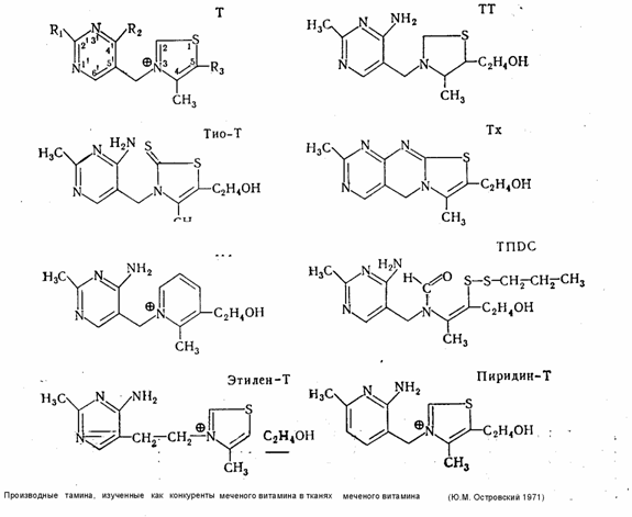 Представление о значении отдельных участков молекулы тиамина в этом процессе легко получить, определяя степень связывания тканями меченного по сере (S35) витамина и некоторых его производных, лишенных тех или иных активных центров, например аминогруппы — окситиамин (окси-Т), аминогруппы и оксиэтильного радикала — хлорокситиамин (ХОТ), четвертичного азота в тиазоловом цикле тетрагидротиамин (TТ) Некоторые ограничения на интерпретацию данных, полученных таким образом в короткие сроки опыта, накладывают физиологические механизмы, транспорта и экскреции вводимых соединений, в связи с чем дополнительно приходится исследовать также выведение витамина и самих меченых соединений с мочой. С другой стороны, результаты, получаемые в длительные сроки (24 часа), почти полностью соответствуют только представлениям о протеидизированной части витамина, а на основании рассмотрения конкурентных взаимоотношений между различными упомянутыми выше мечеными и другими немечеными производными витамина можно последовательно исключать роль отдельных атомов или группировок в механизмах фиксации тиамина тканями.