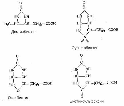По данным Traub (1959), биологическая активность биотина и его аналогов обусловлена внутримолекулярной связью, что позволяет объяснить причины наличия или отсутствия биологической активности для большинства изомеров и производных биотина. Так, образование водородной связи исключено у всех других оптических изомеров, кроме D-биотина, а также у производных с более длинной или укороченной боковой цепью, что приводит к полной потере биологической активности (гомобиотин, норбиотин). Неактивность гуанидиновых аналогов биотина, биотинола, оксибиотинола также объясняется отсутствием у них водородной связи. Некоторые производные биотина, которые образуются без нарушения водородной связи, сохраняют биологическую активность (дестиобиотин, оксибиотин, биоцитин и ряд аминокислотных производных биотина).