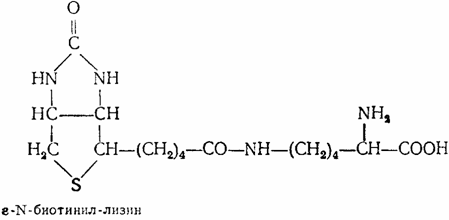 В настоящее время выяснена причина патологических изменений, возникающих при кормлении животных сырым яичным белком. В нем содержится авидин—белок, который специфически соединяется с биотином (введенным внутрь с пищевыми продуктами или синтезированным кишечными микроорганизмами) в неактивный комплекс и тем самым препятствует его всасыванию. Авидин содержится в яичном белке курицы, гуся, утки, индейки и лягушки. В 1942 г. он получен в кристаллическом виде и оказался глюкопротеидом с молекулярным весом 70000. Авидин стехиометричёски связывает эквимолярные количества биотина, образуя прочный комплекс, который не расщепляется ферментами пищеварительного тракта. Комплекс авидина с биотином термически устойчив и полностью диссоциирует только в автоклаве при 120° за 15 минут. С авидином соединяется DL-оксибиотин и некоторые другие аналоги биотина, но сродство авидина к биотину намного больше, чем к его производным. Изучение взаимодействия биотина и его производных с авидином показало необходимость уреидной группы в молекуле витамина, тогда; как карбоксильная группа и атом серы не являются необходимыми для образования комплекса. Авидин является универсальным ингибитором биотина. Его способность связывать биотин широко используется при изучении механизма участия этого витамина в процессах обмена веществ: торможение той или иной биохимической реакции авидином является существенным доводом в пользу возможности участия в ней биотина. Авидин применяется для получения экспериментальной биотиновой недостаточности у животных.