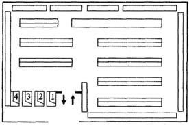 · «Решетка» со смешанным линейным размещением оборудования, т.е. сочетание в торговом зале и продольного и поперечного размещения (рис. 2.2.3.)