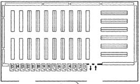 · «Решетка» с линейным продольным размещением оборудования, т. е. стеллажи с товарами преимущественно располагаются перпендикулярно входящему в зал покупательскому потоку (рис. 2.2.1.).