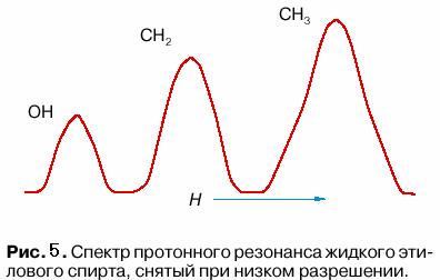 Впервые сообщения об открытии химического сдвига появились в нескольких публикациях 1950 — 1951 годов. Среди них необходимо выделить работу Арнольда с соавторами (1951 год), получивших первый спектр с отдельными линиями, соответствующими химически различным положениям одинаковых ядер 1H в одной молекуле. Речь идет об этиловом спирте CH3CH2OH, типичный спектр ЯМР 1H которого при низком разрешении показан на рис. 5.