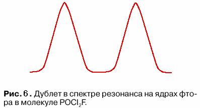 В 1951 — 1953 годах при записи спектров ЯМР ряда жидкостей обнаружилось, что в спектрах некоторых веществ больше линий, чем это следует из простой оценки числа неэквивалентных ядер. Один из первых примеров — это резонанс на фторе в молекуле POCI2F. Спектр 19F состоит из двух линий равной интенсивности, хотя в молекуле есть только один атом фтора (рис. 6). Молекулы других соединений давали симметричные мультиплетные сигналы (триплеты, квартеты и т.д.).
