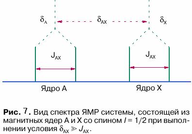 На рис. 7 показано, как выглядит спектр ЯМР, если оба ядра, то есть А и Х, имеют спин, равный 1/2. Расстояние между компонентами в каждом дублете называют константой спин-спинового взаимодействия и обычно обозначают как J(Гц); в данном случае это константа JАХ.