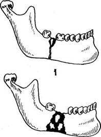 Клинические наблюдения показывают, что при двусторонних переломах нижней челюсти травматический остеомиелит в большинстве случаев развивается обычно на одной стороне.
