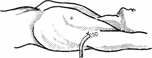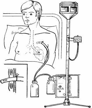Суть квалифицированной и специализированной хирургической помощи при этом состоянии заключается в восстановлении герметичности плевральной полости и раннем расправле-нии коллабированного легкого. Выжидательное консервативное лечение допустимо только при незначительном спадении легкого (не более, чем на 'А объема) и при отчетливо положительном течении заболевания на протяжении первых 1— 2 нед. Однако такие варианты спонтанного пневмоторакса встречаются относительно редко, и большинство больных нуждается в активной аспирации воздуха из плевральной полости путем периодических плевральных пункций, активном дренировании ее с обязательным введением антибиотиков при пункции или через дренаж (рис. 14). В тех случаях, когда поступление воздуха в плевральную полость через бронхоплевральное сообщение прекратилось, достаточно 1—2 пункций.