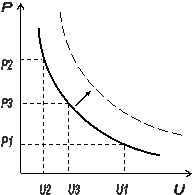 Если правительство страны рассматривает уровень безработицы U1 (ему соответствует темп роста цен Р1) как чрезвычайно высокий, то для его понижения проводятся бюджетные и денежно-кредитные мероприятия, которые стимулируют спрос. Это ведет к расширению производства, созданию новых рабочих мест. Норма безработицы снижается до величины U2, но одновременно возрастают темпы инфляции до Р2. Возникшие условия могут вызвать «перегрев» экономики, серьезные кризисные явления, что вынудит правительство ввести кредитные ограничения, сократить расходы из государственного бюджета и др. В результате темпы роста цен снизятся до уровня Р3, а безработица возрастет, ее норма составит U3.