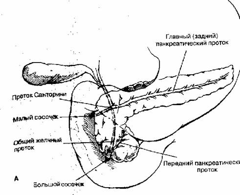6. Добавочный проток поджелудочной железы (Санториниев проток) открывается на малом сосочке на 2 см выше большого дуоденального сосочка.