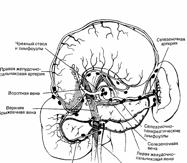 Лимфатические узлы расположены по ходу сосудов и в большинстве своем заканчиваются в панкреатоселезеночных лимфатических узла. Часть лимфы также поступает в панкреатодуоденальные и периаортальные лимфатические узлы возле устья верхней брыжеечной артерии.