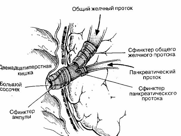 5. Проток поджелудочной железы (Вирсунгов проток) сливается с общим желчным протоком, образуя ампулу Фатерова сосочка двенадцатиперстной кишки. В 20% случаев протоки в двенадцатиперстную кишку впадают раздельно.