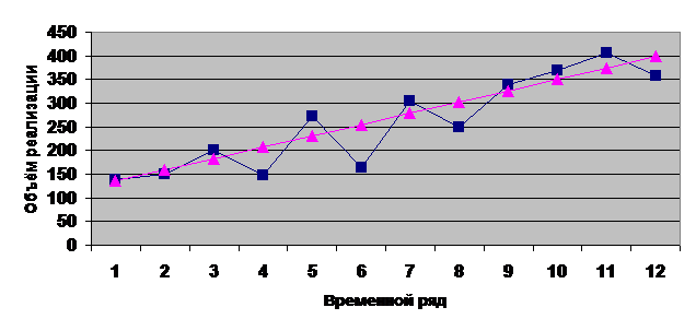 Анализируя построенные графики можно сделать сказать, что расчетные данные прогноза практически сохраняют ту же тенденцию развития, что и реальные данные об объемах реализации.