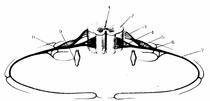 Очень важно знать топографические взаимоотношения сегментов спинного мозга с позвоночным столбом (скелетотопия сегментов). Протяженность спинного мозга значительно меньше длины позвоночного столба, поэтому порядковый номер какого-либо сегмента спинного мозга и уровень его положения, начиная с нижнего шейного отдела, не соответствует порядковому номеру одноименного позвонка (рис. 3).