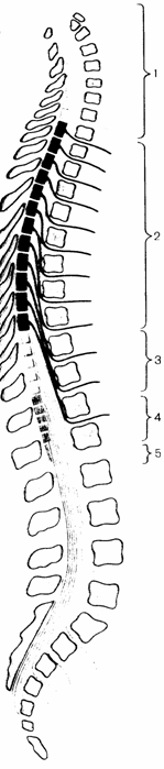 Положение сегментов по отношению к позвонкам можно определить следующим образом. Верхние шейные сегменты расположены на уровне соответствующих их порядковому номеру тел позвонков. Нижние шейные и верхние грудные сегменты лежат на один позвонок выше, чем тела соответствующих позвонков. В среднем грудном отделе эта разница между соответствующим сегментом спинного мозга и телом позвонка увеличивается уже на 2 позвонка, в нижнем грудном — на 3. Поясничные сегменты спинного мозга лежат в позвоночном канале на уровне тел X, XI грудных позвонков, крестцовые и копчиковый сегменты — на уровне XII грудного и 1 поясничного позвонков.