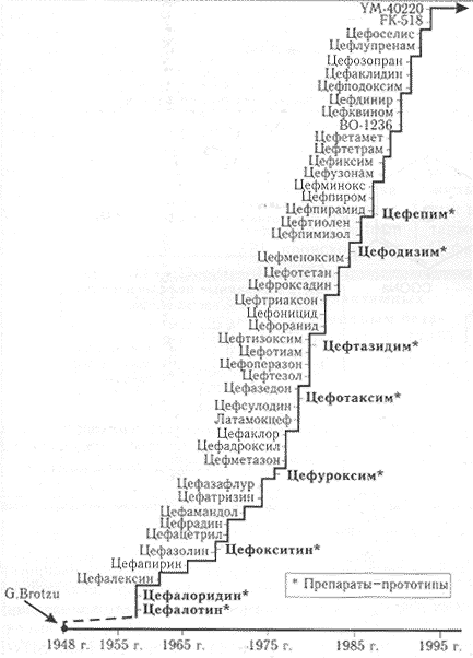 Рождение цефалоспоринов справедливо связывают с работами G.Brotzu, предположившего в начале 40-х годов, что периодическое самоочищение сточных вод в Сардинии обусловлено ингибирующей активностью особых микроорганизмов. В 1945 г. ему удалось выделить гриб Cephalosporium acremonium (в настоящее время именуемый Acremonium chrysogenum), обладавший выраженной антибактериальной активностью по отношению к грамположительным и грамотрицательным микроорганизмам. Следующим этапом (с 1955 по 1962 г.) явилось детальное изучение С.acremonium рабочими группами H.Florey и E.P.Abraham. Из продуктов обмена веществ этого гриба удалось выделить бактерицидную субстанцию - цефалоспорин С, ставшую исходным веществом для получения 7-аминоцефалоспорановой кислоты - структурной основы цефалоспоринов.